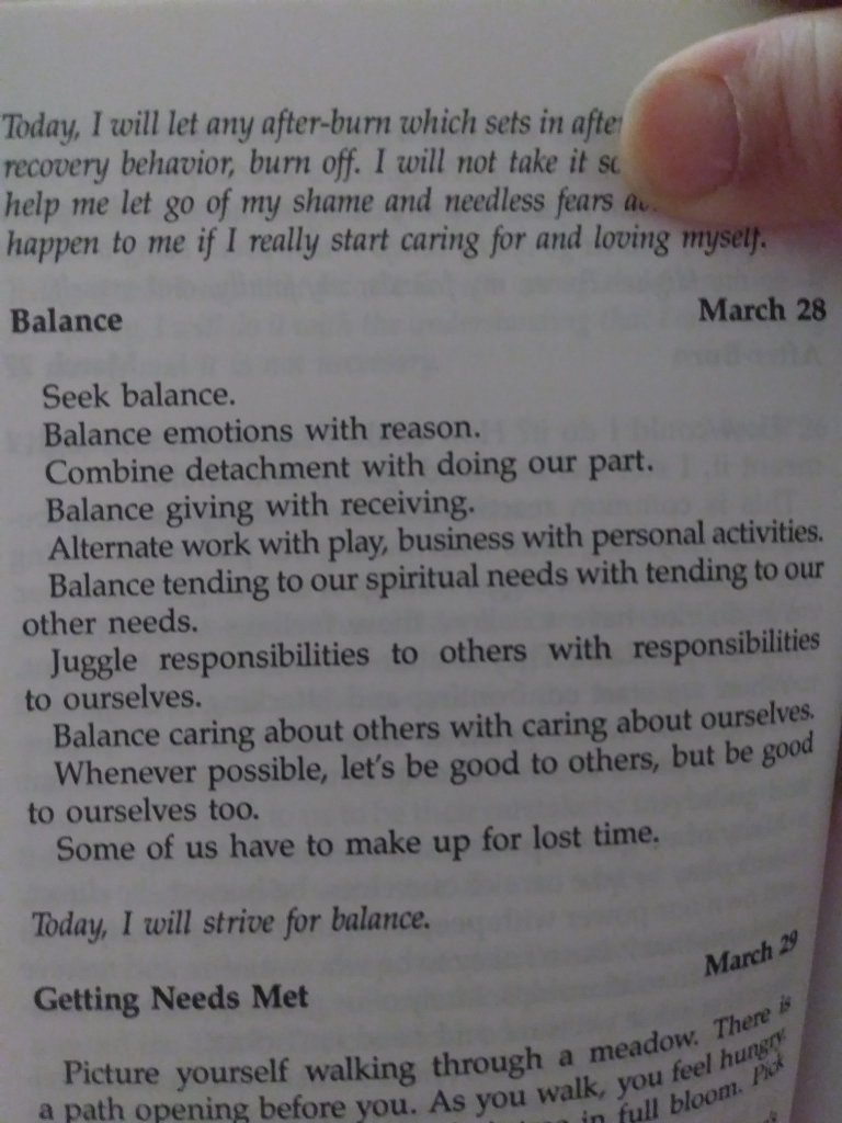 This is a good reminder for me to remember to be vigilant and continue to strive for balance in my life- in all aspects. I do struggle with the juggling act of balance. Some days I do better than others! This reading reminds me of the importance of balance, and reminds me that I need to strive for balance in all aspects of my life daily so that I can not only be of better service to others, but to practice better self care as well.